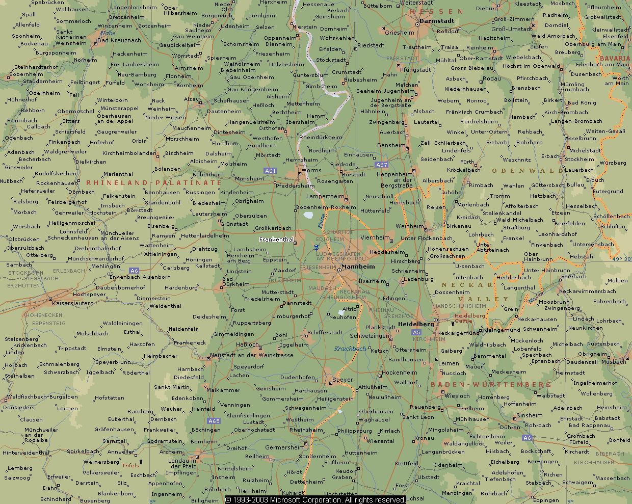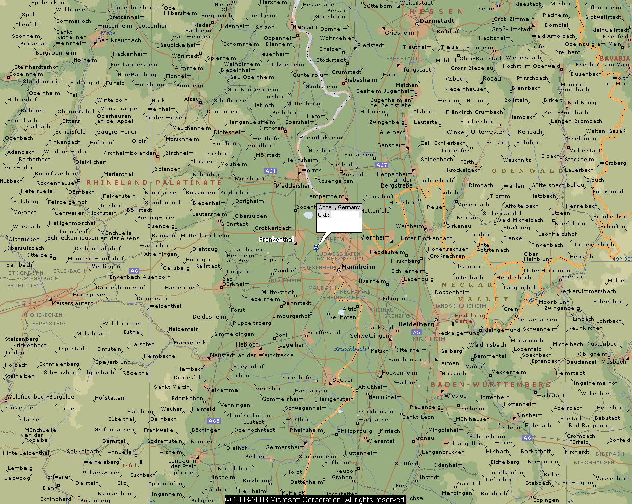 Oppau, Germany is in the Palatine area, just a few miles northwest of Mannheim, just a few miles from the Rhine. Here are some maps that show its location. Oppau is in the center of each map, where the little pushpin is. The maps are quite large -- about 450K each. Many people immigrated to the US from Oppau in the first part of the 18th century. Many of those who immigrated went to the Palatine area of Pennsylvania near York, with many others going to Meigs County, Ohio. Here is a discussion group about them. Oppau and the neighboring village of Edigheim have been long occupied. The first documentary mention of Edigheim was in 772 and, for Oppau, 808. |